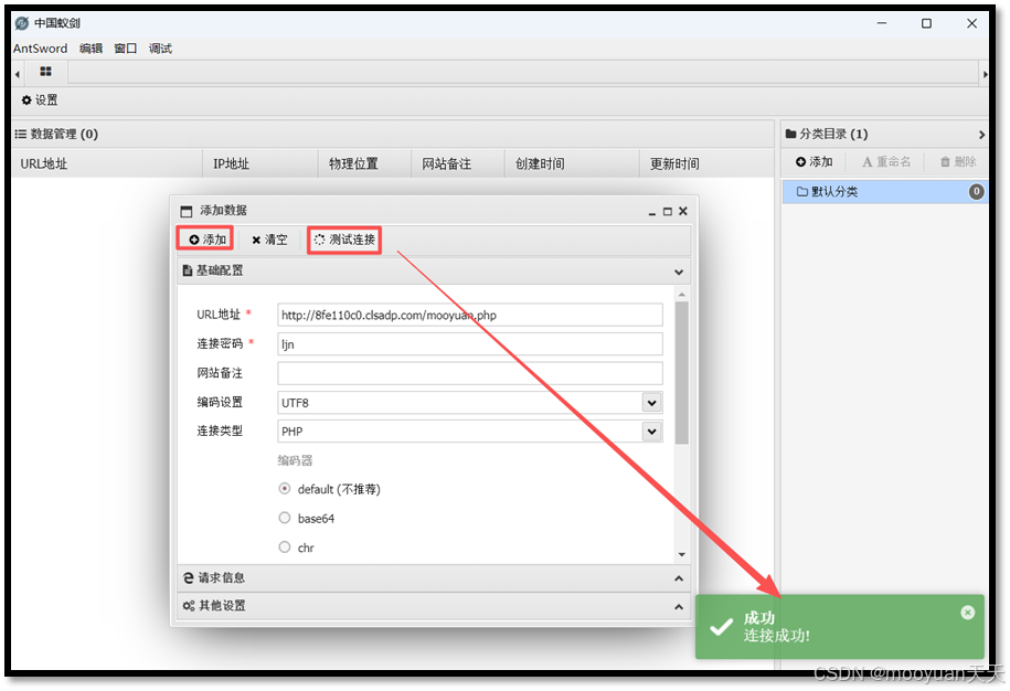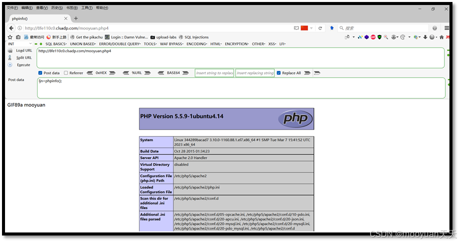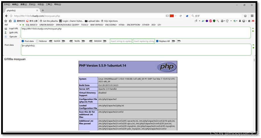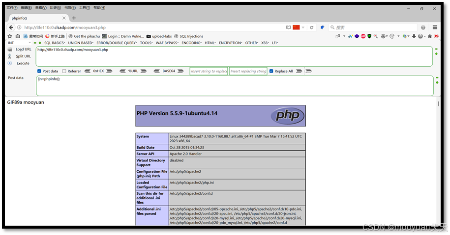 对于上传成功的脚本使用浏览器连接,通关hackbar进行post参数渗透,如下所示渗透成功。