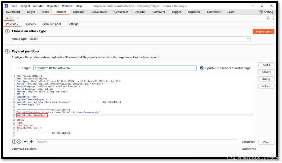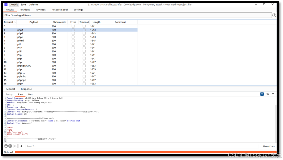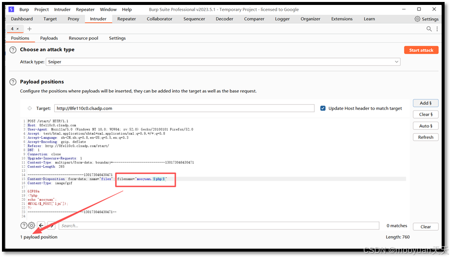 对上传的文件名mooyuan.php的后缀php选中并点击add,效果如下所示,添加完毕后左下角的payload数量变为1。