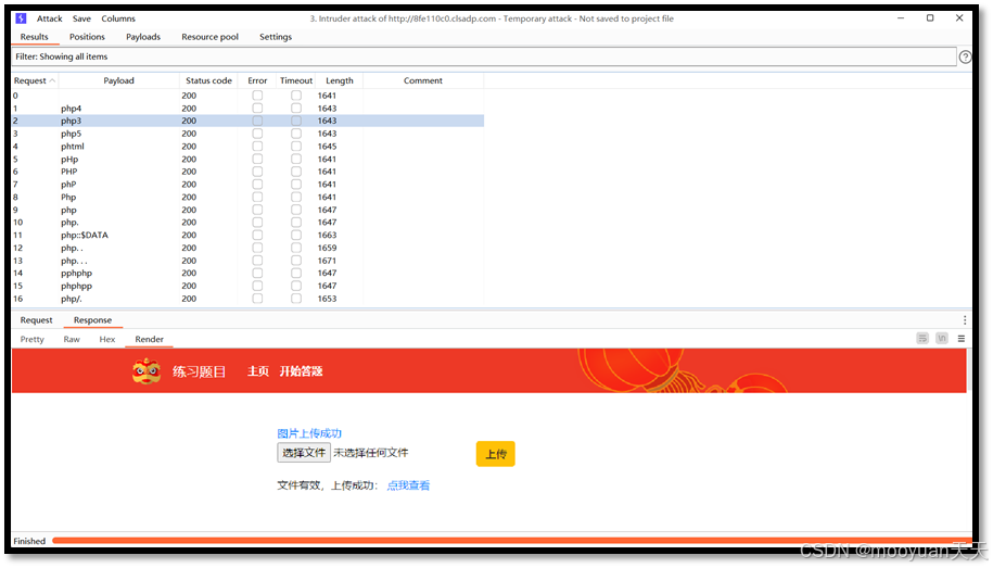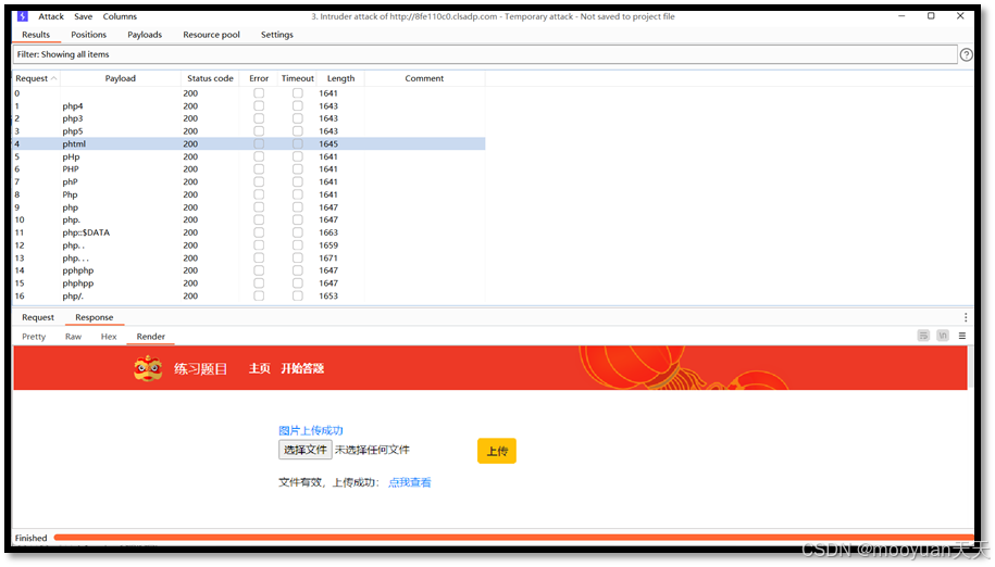 点击response-render,具体如下所示,发现多个后缀替换均成功绕过,其中报错php4、php3、php5、phtml等。