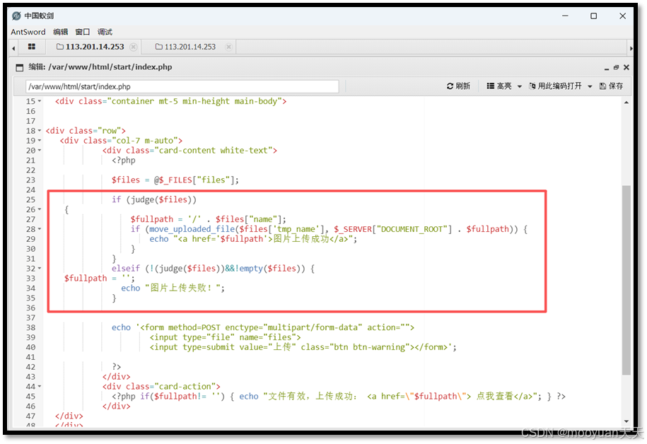 完整的源码内容如下所示,这是一个具有安全风险的文件上传页面,通过judge函数验证用户上传的文件后将其保存到服务器指定路径,并提供了文件查看链接。