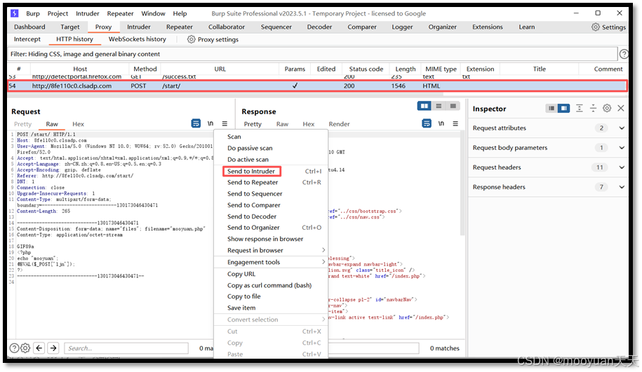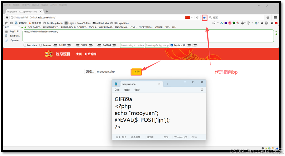 开启bp,同时浏览器代理指向bp,选择mooyuan.php文件并点击上传,如下所示。