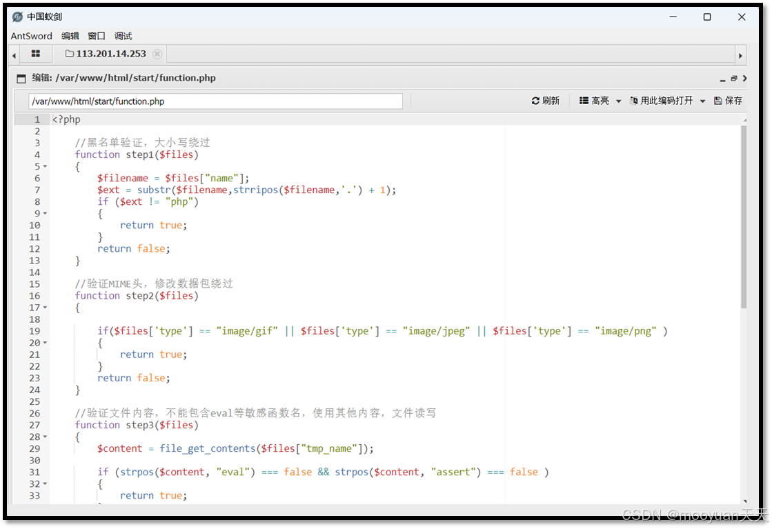 完整的经过注释后的代码如下所示,这是一个存在多处安全风险的文件上传验证系统。它包含四个验证函数:step1通过黑名单检查扩展名但存在大小写绕过风险且未被实际调用;step2验证MIME类型但可被数据包伪造绕过;step3检测文件内容中的"eval"和"assert"函数但可通过编码方式绕过;step4验证文件头相对可靠但配合其他安全风险仍可能被利用。核心问题在于judge函数未调用step1扩展名验证,且整体采用黑名单机制,加上关键验证依赖客户端可控数据,导致攻击者可通过大小写变换、数据包篡改、内容编码等多种方式成功上传恶意文件。