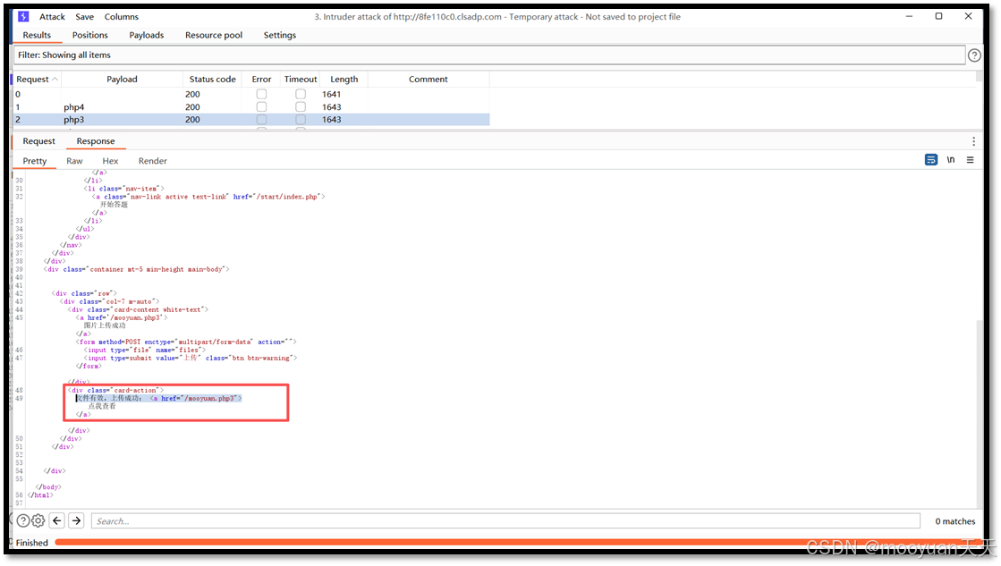 以mooyuan3.php为例,找到response的pretty内容,分析其路径,如下所示说明mooyuan3.php被传到网站的根目录下/mooyuan.php3,故而URL如下所示。