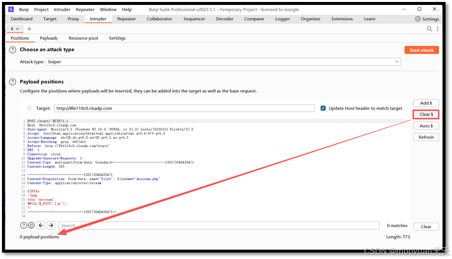 发送到intruder后,首先点击clear将position的数量变为0,具体如下所示。
