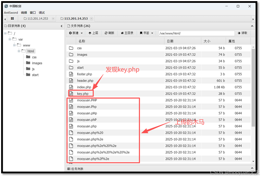 进入到文件上传upload的目录/var/www/html/,如下所示都是我们上传成功的多个木马文件,同时我们还发现了key.php,如下所示。。