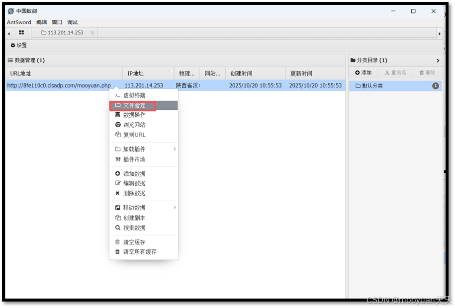 连接蚁剑工具成功后,右键文件管理进入文件系统,具体如下所示。