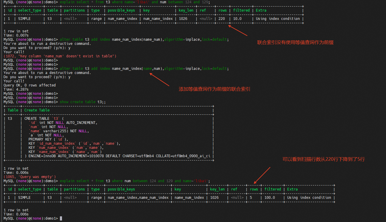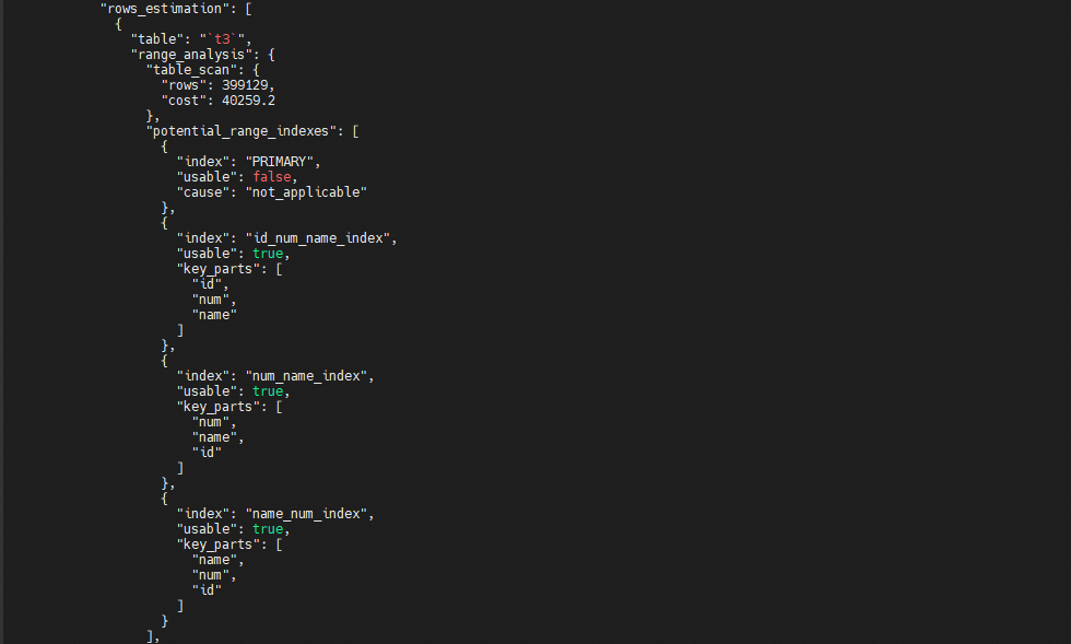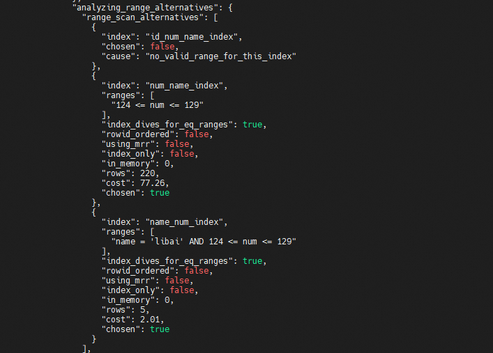 在往下看"analyzing_range_alternatives"中的"range_scan_alternatives"可以看到"index": "id_num_name_index"被淘汰,而"index": "num_name_index"和 "index": "name_num_index"被标记可。,但是"index": "num_name_index"扫描"rows": 220,"cost": 77.26,而"index": "name_num_index"扫描"rows": 5,"cost": 2.01