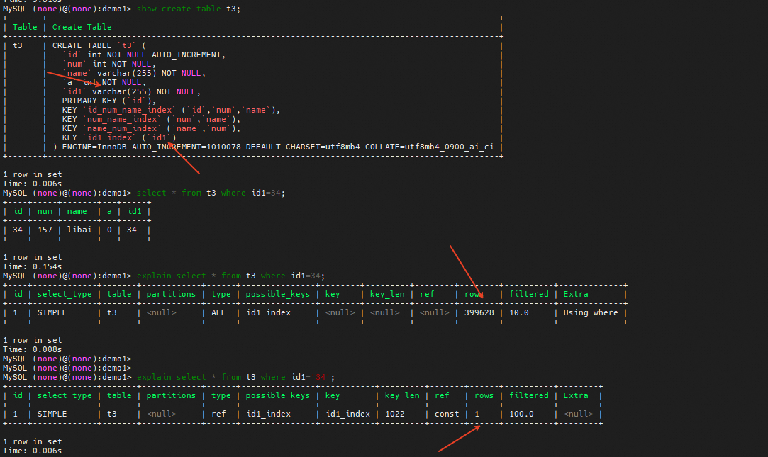 当索引列类型和常量类型不一致的时候,可能导致索引无法使用。例如下面的例子,列类型是varchar,而常量类型是Int。在MySQL中varchar类型和int类型比较是会将varchar转换为int类型去比较,这就导致下面语句需要扫描每一行数据将id转换为int类型再做比较。