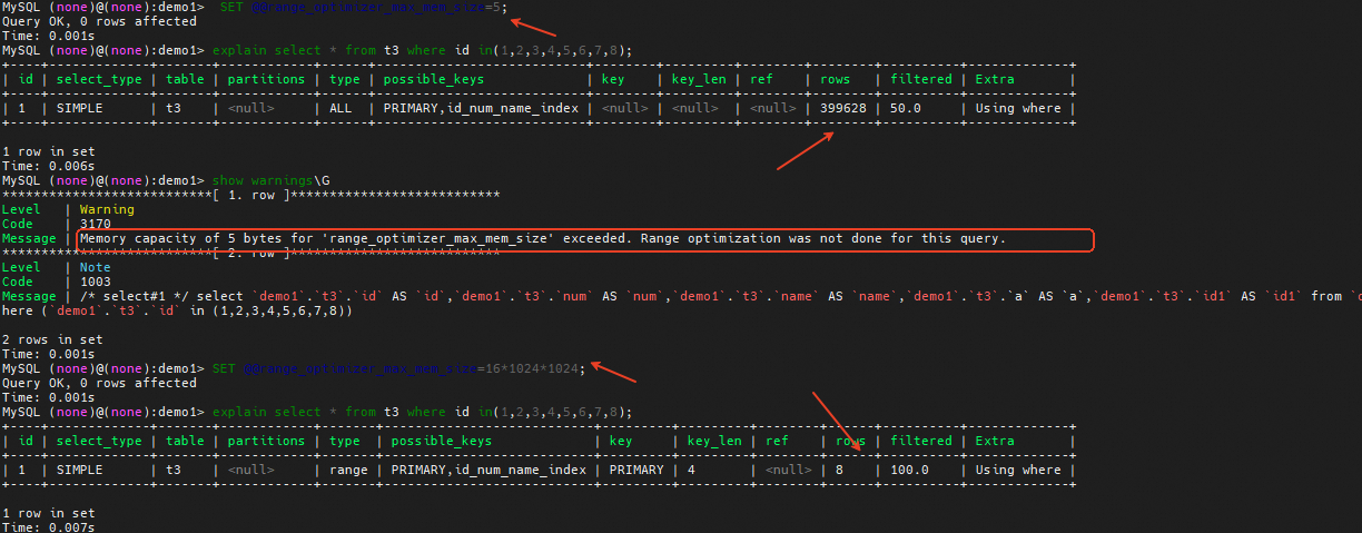 索引的扫描范围分析是由range optimizer处理,一些场景会触发range optimizer的限制。例如in list或者or的条件数太多,在分析扫描范围区间的时候,会消耗大量内存,导致超过range_optimizer_max_mem_size的大小,这类语句EXPLAIN后,在warnings信息中会有提示: