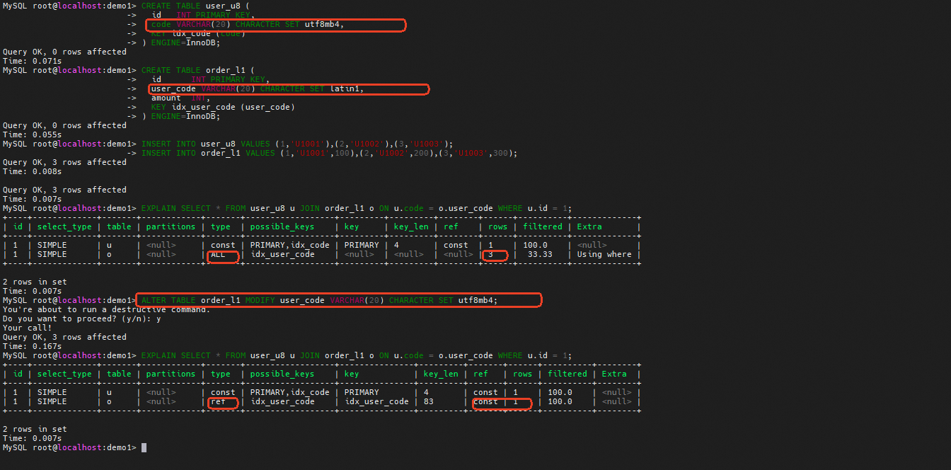 对于JOIN操作,如果关联字段的字符集不一致,这也会导致索引无法被有效利用,进而导致扫描大量数据,查询执行慢。