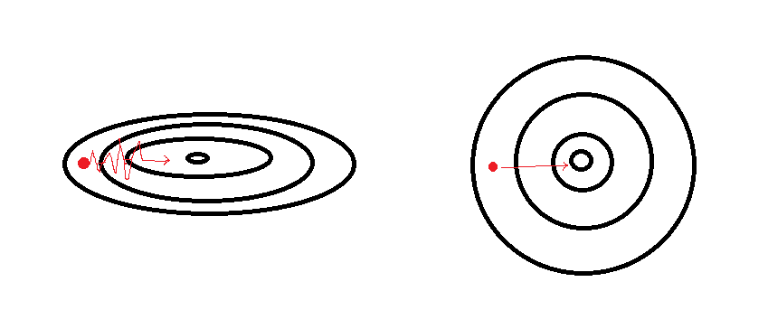 如图所示,假设其为代价函数的等高线图,在未作归一化操作时,代价函数更为狭长,在这样的函数上寻找最优解往往更加困难,会需要很小的学习率,因为搜索路径会来回震荡。而像图右边的更圆的等高线,初始值无论从哪里开始都能够直达最小值,不会产生震荡,这时可以采用较大的学习率加速收敛。总的来说,对输入特征做归一化是可以加速模型收敛的。