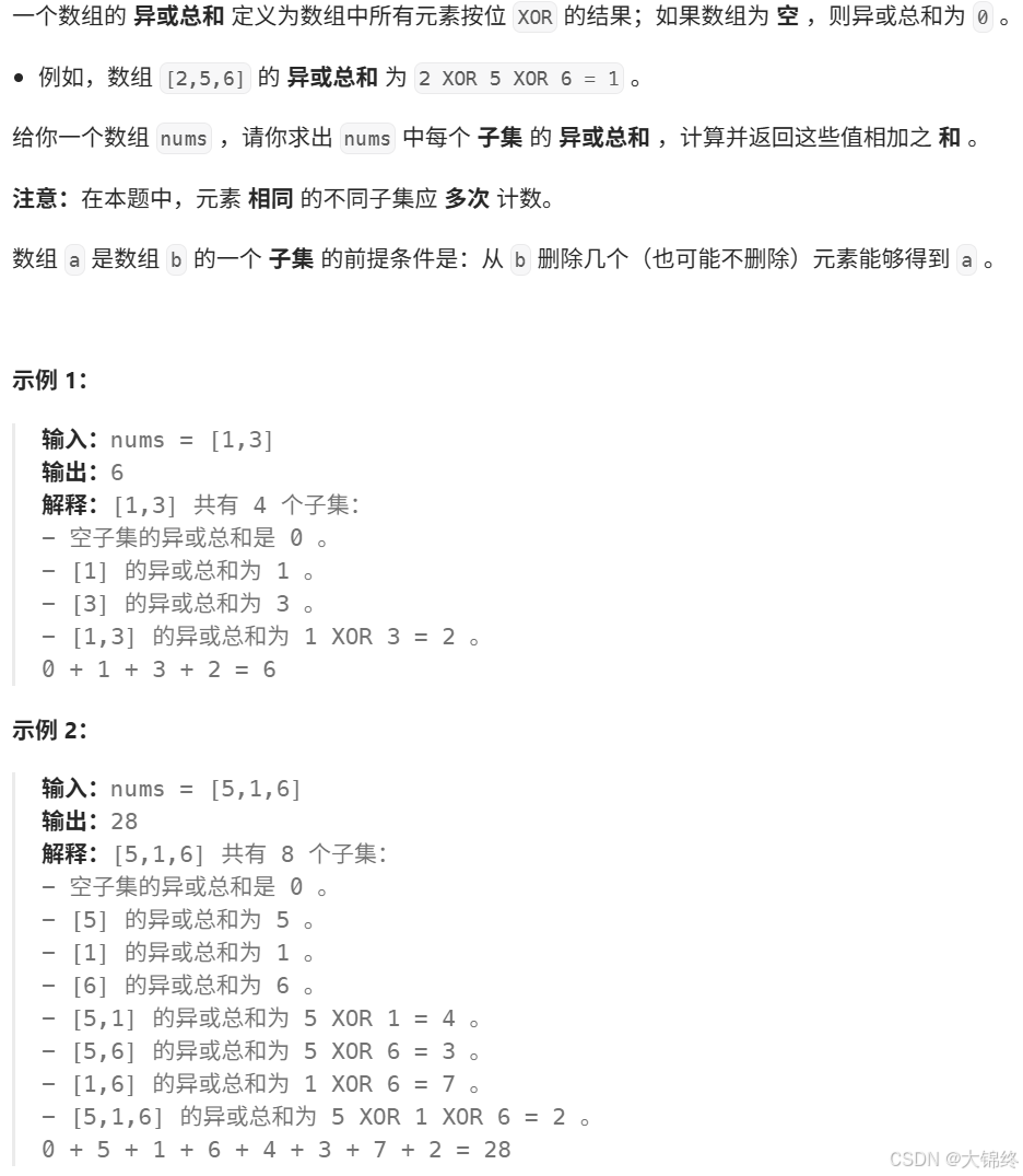 与之前写过的题类似,首先求所有子集,再在过程中计算异或和。还是设置全局变量,之前的path是用来保存路径的,本题用于保存当前层路径的异或和,没有递归出口通过循环来控制下标,通过可选位置来判断是否为有效子集可以避免无效遍历,参数传递需要一个参数来标记当前递归到哪一层了,每次递归将path值加入到全局变量num中保存和,回溯的恢复现场通过异或两个相同的数相互抵消的性质来进行