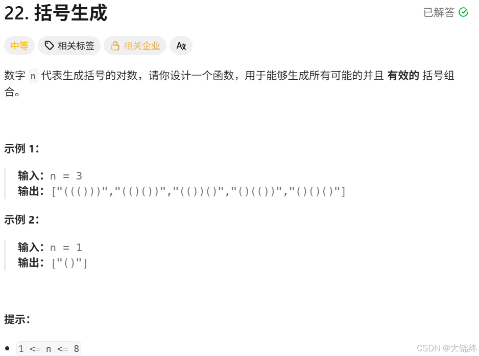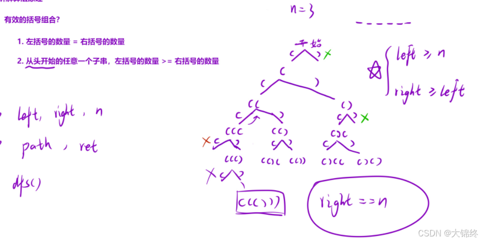 首先明确有效括号的条件,几对括号可以转化为对应有多少个位置可以填括号,以此深搜,进行剪枝优化结果。用left、right记录当前左右括号数量,n为括号对数,path为当前组合,ret为最终结果,都设置为全局变量时dfs就无参,调用很方便,注意回溯后的手动恢复现场