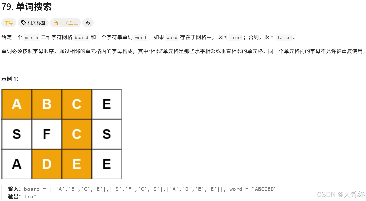 这是二维数组的dfs问题,根据题目要求只能往上下左右四个相邻的位置去寻找,不能斜线找,那么就可以定义一个向量组来表示一个位置四周的变化范围,先找到二维数组中与字符串中第一个字符匹配的位置,再基于这个位置进行dfs搜索,定义一个pos变量代表字符串中的下标,每次查找时根据变化的坐标是否符合条件、该位置元素是否使用过、二维数组中该位置元素与目标字符是否相等来剪枝,dfs的返回条件是pos位置等于字符串长度时,证明查找到了单词的完整路径