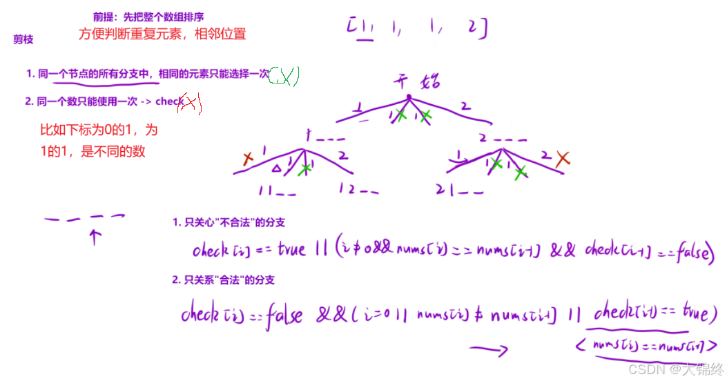 check[i-1] == false:前一个元素未被使用(说明是 "同一层递归" 中重复的元素)→ 非法(违反 "同一节点分支中相同元素只能选一次")。