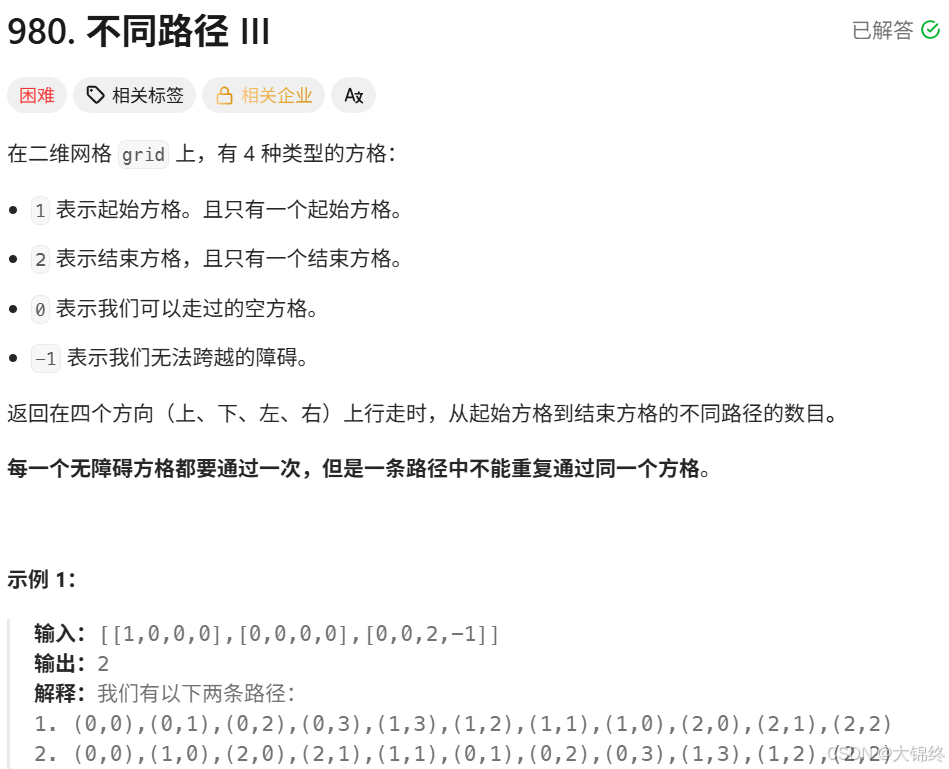 2.用step变量来记录原矩阵中无障碍方格有多少个,dfs传参时多传一个count变量来记录dfs的步数,如果step与count相等证明路径合法