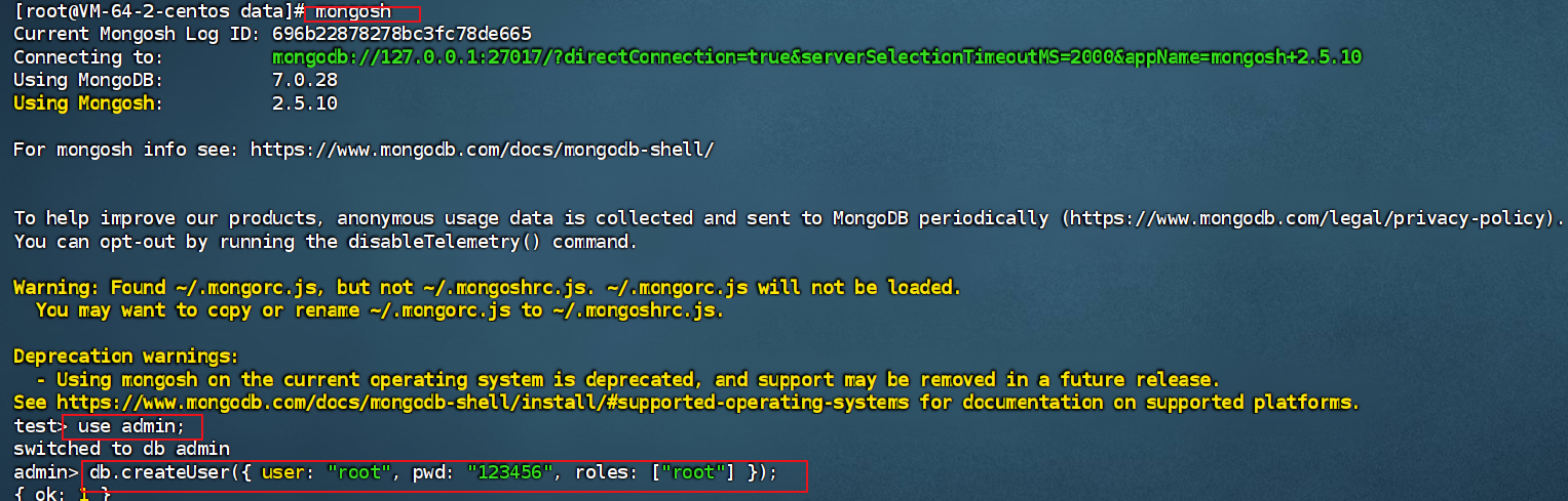控制台执行 mongosh,执行如下命令: