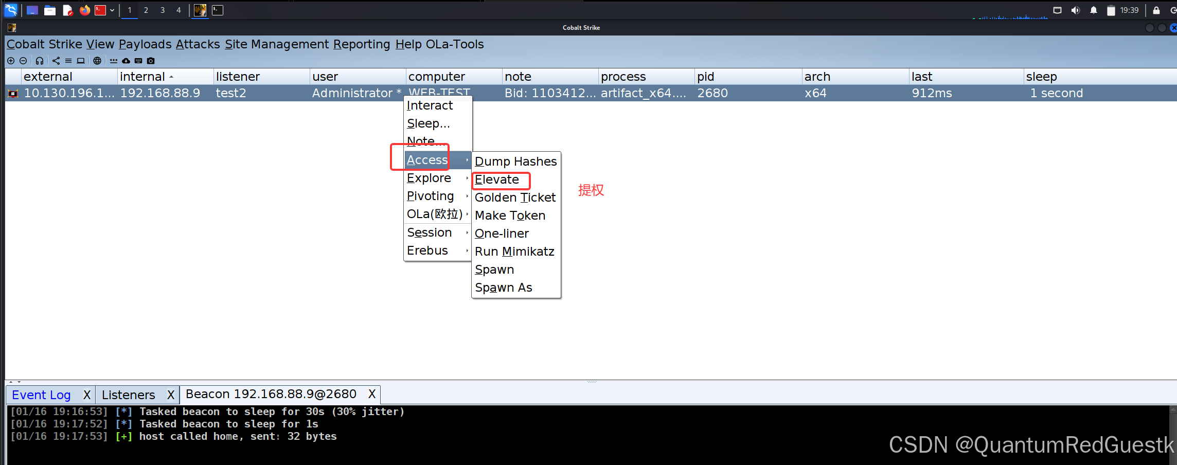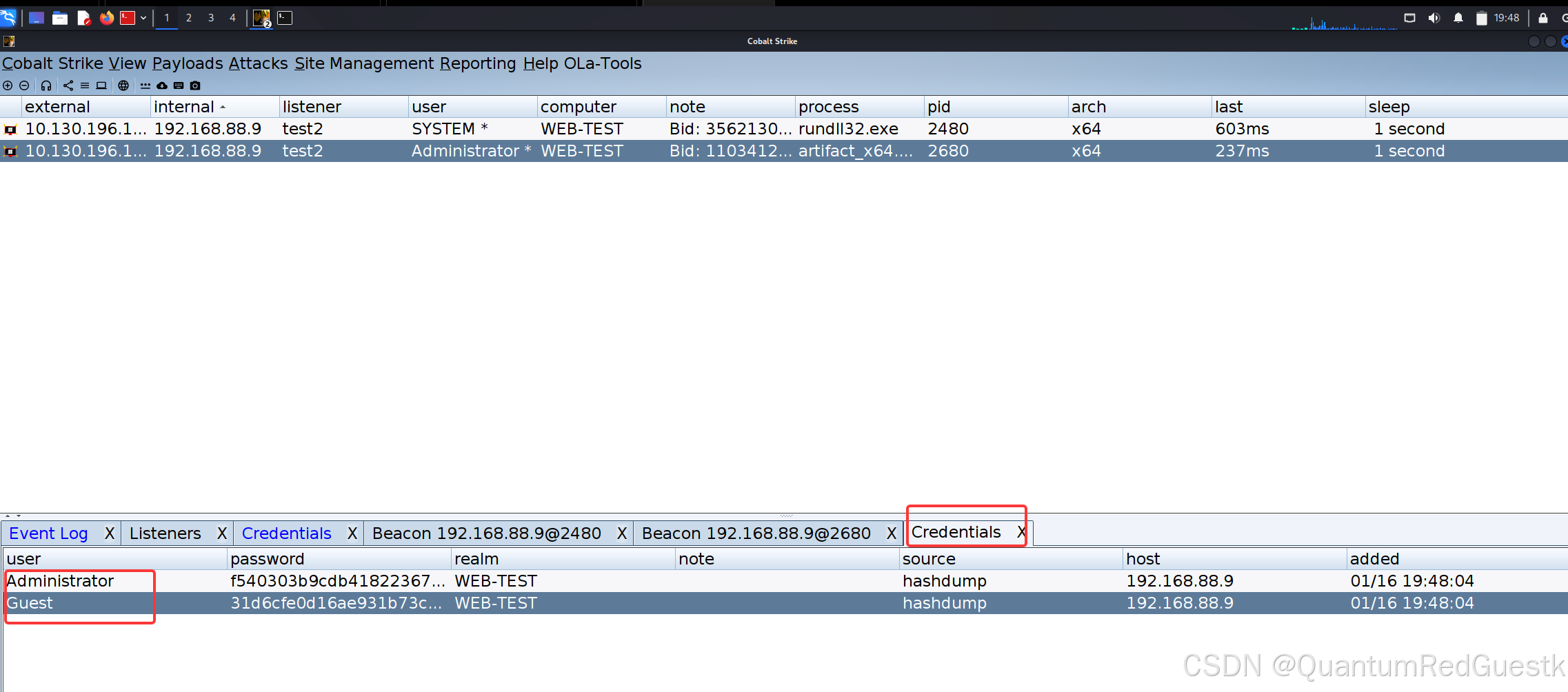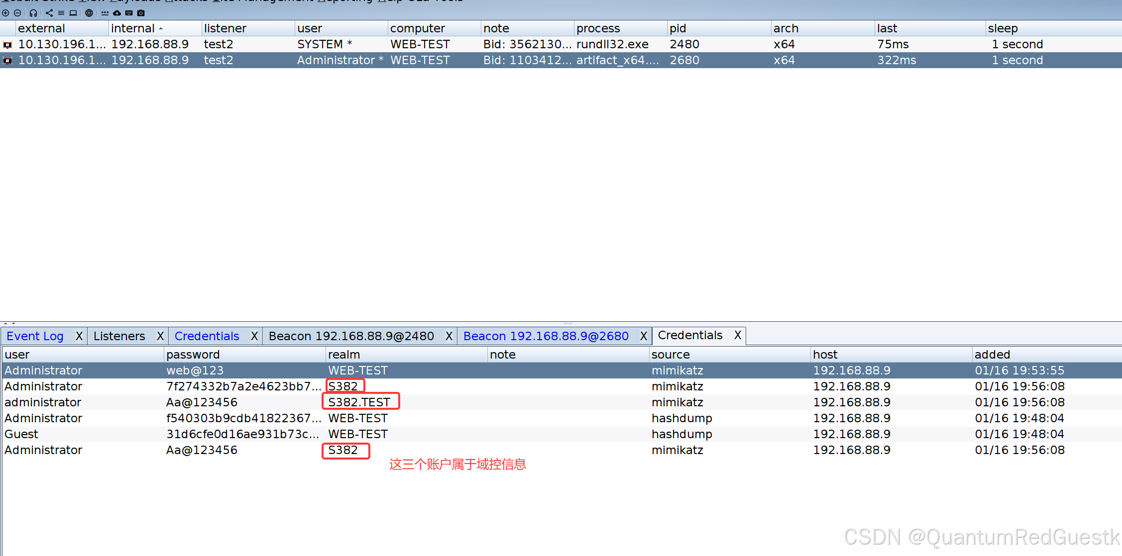 前面环境介绍了,因为kali只有桥接模式,是连不上NAT的内网地址的,所以hash能传到88.8域控主机,但是传不回kali,就无法回连CS。