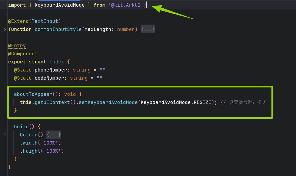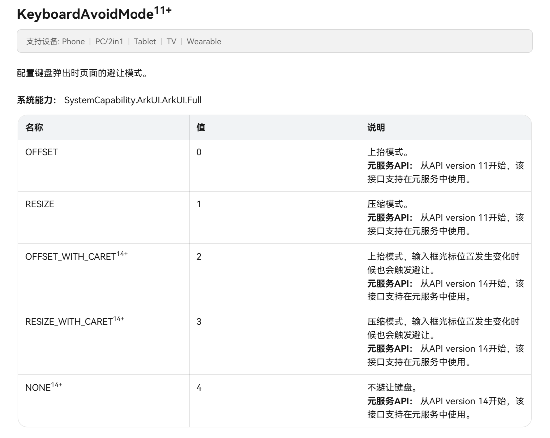 KeyboardAvoidMode配置键盘避让页面的避让模式,其中KeyboardAvoidMode.RESIZE表示压缩模式