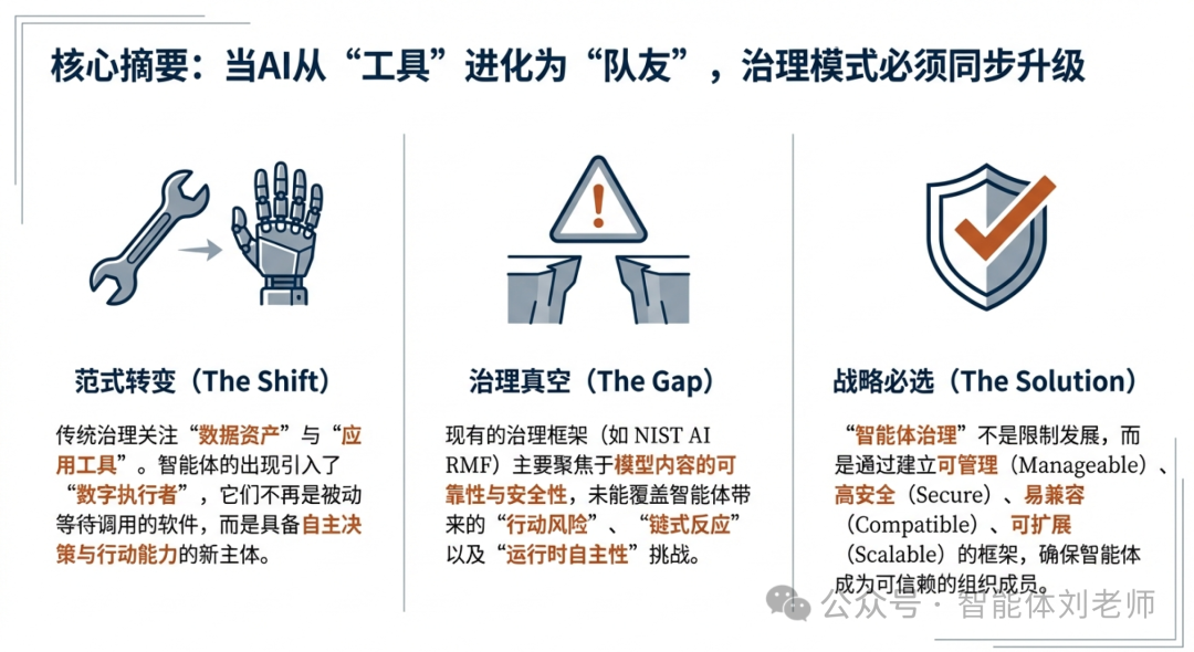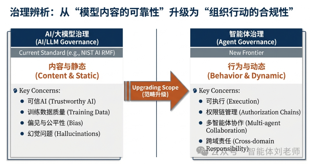 因此,"智能体治理"可以被视为:在 AI/大模型治理之上,面向'可执行、可协作、可跨域'智能体网络的治理升级。