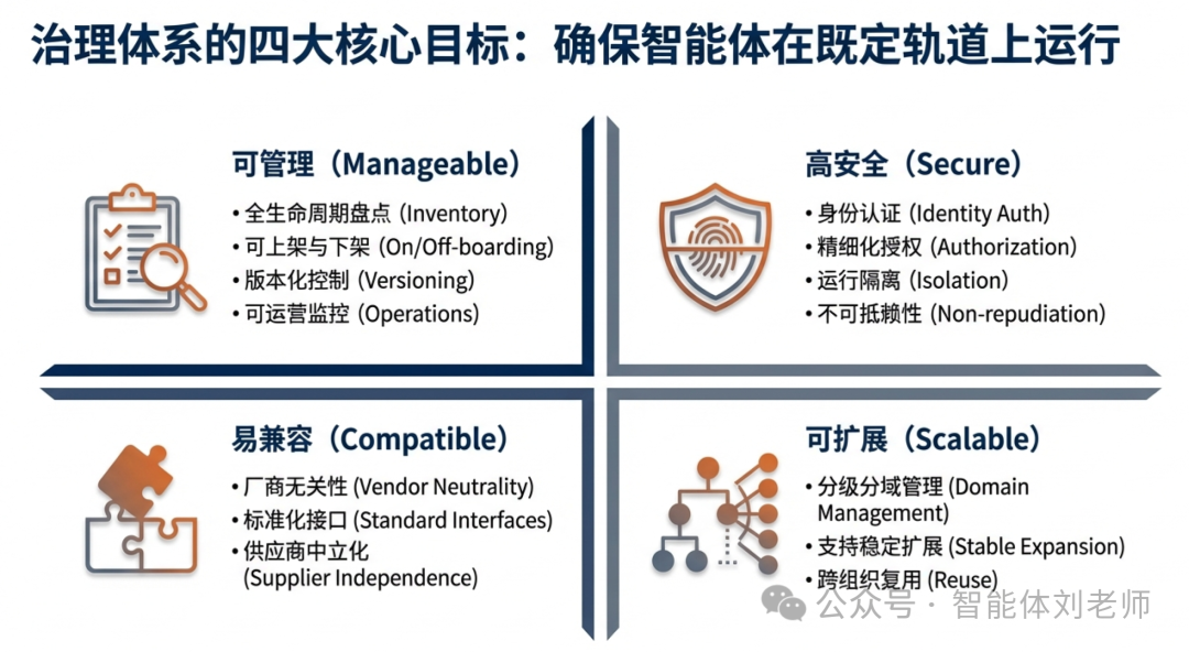 智能体治理的核心要素包括:身份与可信、能力与接口、权限与策略、上线/下线与变更、协作与跨域边界、审计与追责、风险与合规等。