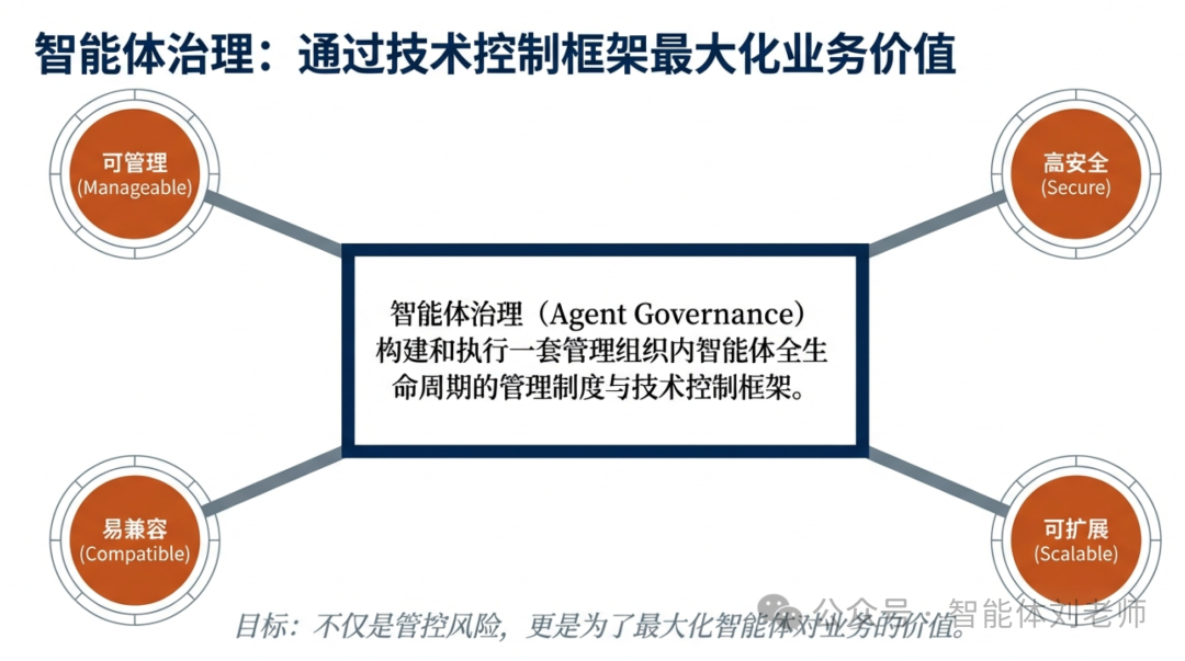 智能体治理(Agent Governance)是指:构建和执行一套管理组织内智能体全生命周期的管理制度与技术控制框架,以实现智能体运营的可管理、高安全、易兼容和可扩展性等属性,从而最大化智能体对业务的价值。