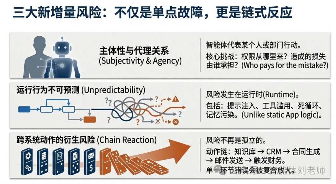 跨系统动作的衍生风险:智能体一次任务可能串联多个系统,例如:检索知识库→写 CRM→生成合同→发邮件→触发财务流程。风险不再是单点故障,而是"动作链"与"权限链"的复合放大。