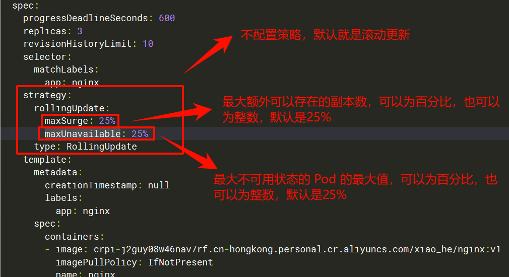使用kubectl get deploy nginx -o yaml查看默认的策略(生成环境中默认的策略已经足够用了)