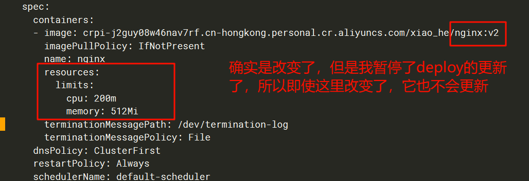 这个时候我们通过kubectl edit deploy nginx命令可以看到镜像和资源限制确实是改变了的