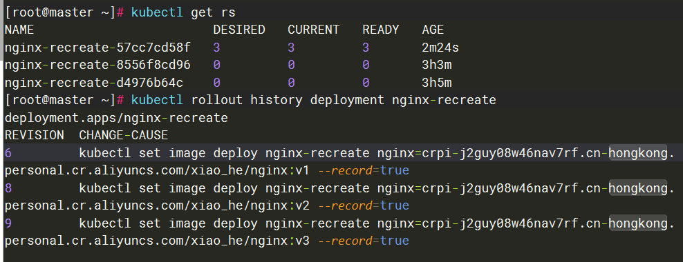 [root@master ~]# kubectl set image deploy nginx-recreate nginx=crpi-j2guy08w46nav7rf.cn-hongkong.personal.cr.aliyuncs.com/xiao_he/nginx:v3 --record