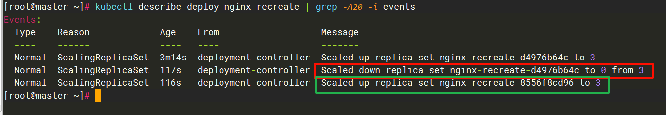 使用kubectl describe deploy nginx-recreate命令可以看到控制器是先把旧的副本 Pod 全部停止删除后,再创建的新的副本 Pod。