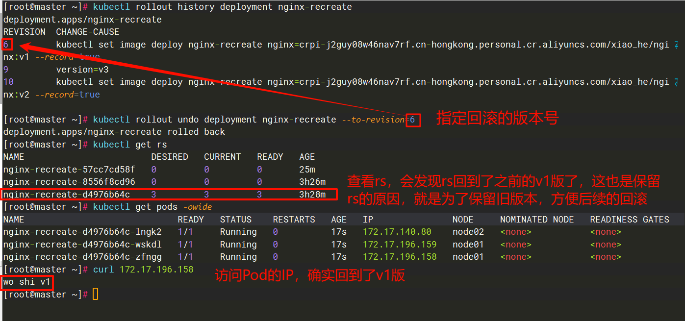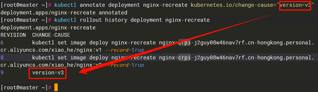 当然也可以使用 kubectl annotate deployment nginx-recreate kubernetes.io/change-cause="version=v3"给当前版本添加注释,方便后续在回滚的时候知道该版本的具体信息