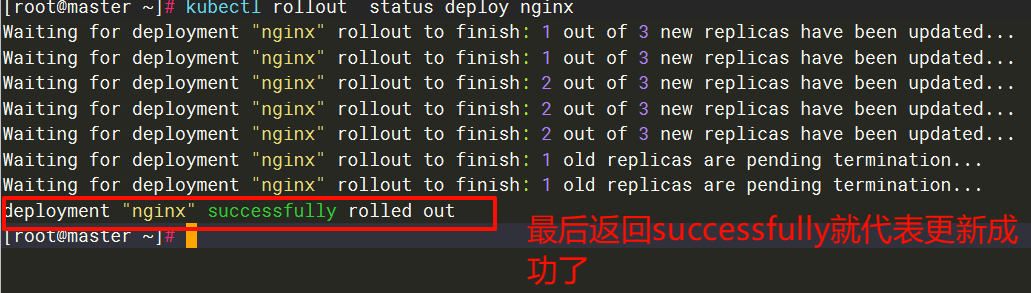 使用kubectl rollout status deploy nginx命令来查看 Deployment 滚动更新过程的实时状态日志,该命令要在更新操作后立即执行,否则会看不到过程。