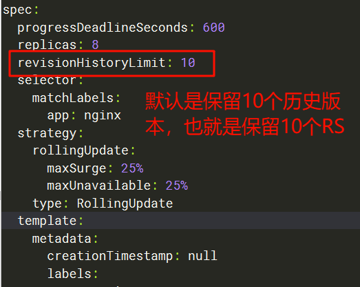 在默认情况下,revision 保留 10 个旧的 ReplicaSet,其余的将在后台进行垃圾回收,可以在.spec.revisionHistoryLimit 设置保留 ReplicaSet 的个数。当设置为 0 时,不保留历史记录。实际应用中根据需求来调整。