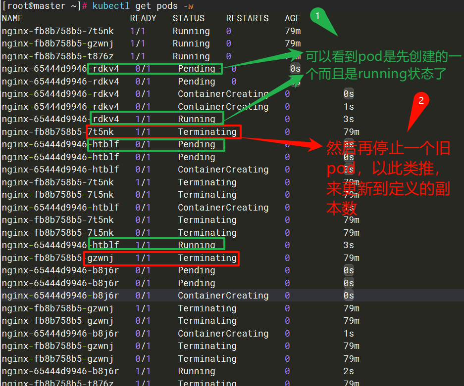 滚动更新策略就是先启动新的 Pod 副本,再停止删除旧的,逐步替换完成更新。