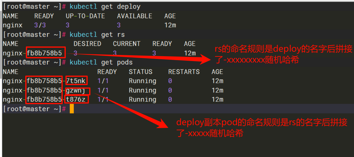 - NAME:RS 的名称(Deployment 创建的 RS 会带 "Deployment 名 + 随机哈希" 后缀,用于区分版本);