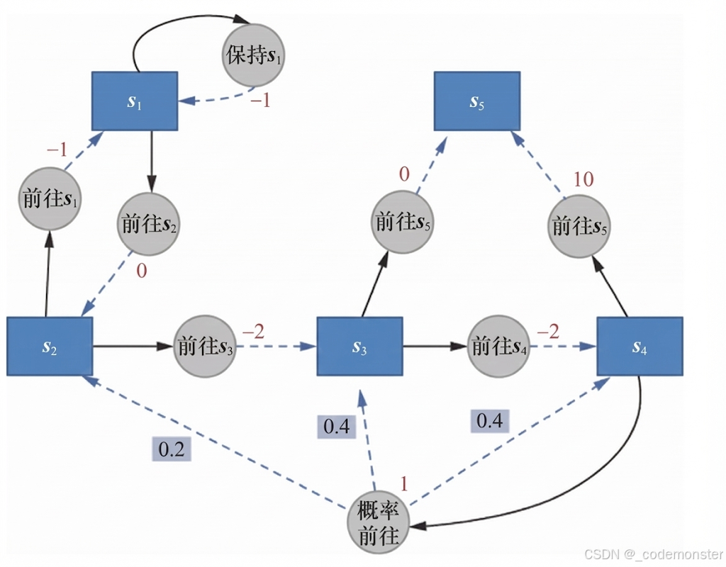 "当前状态-执行动作":即时奖励 - s5是终止状态(没有从s5出发的转移)