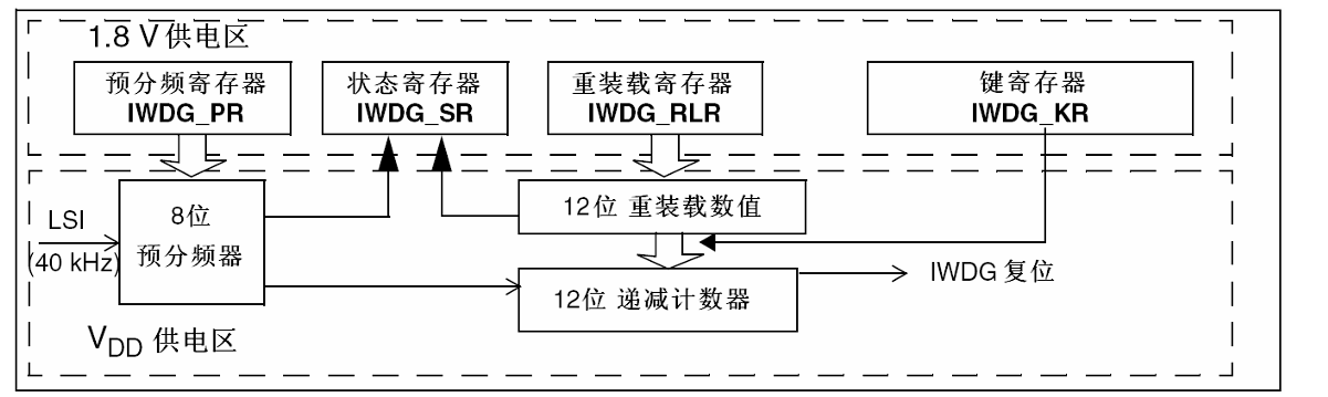 - 无论何时,只要在键值寄存器IWDG_KR中写入0xAAAA(通常说的喂狗),自动重装载寄存器IWDG_RLR的值就会重新加载到计数器,从而避免看门狗复位。