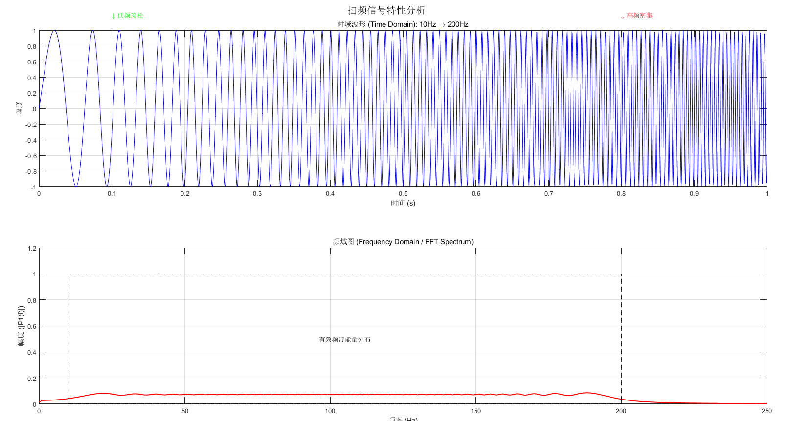 在工程中,生成扫频信号的主要目的是为了进行 系统辨识 (System Identification) 或 频率响应测试。