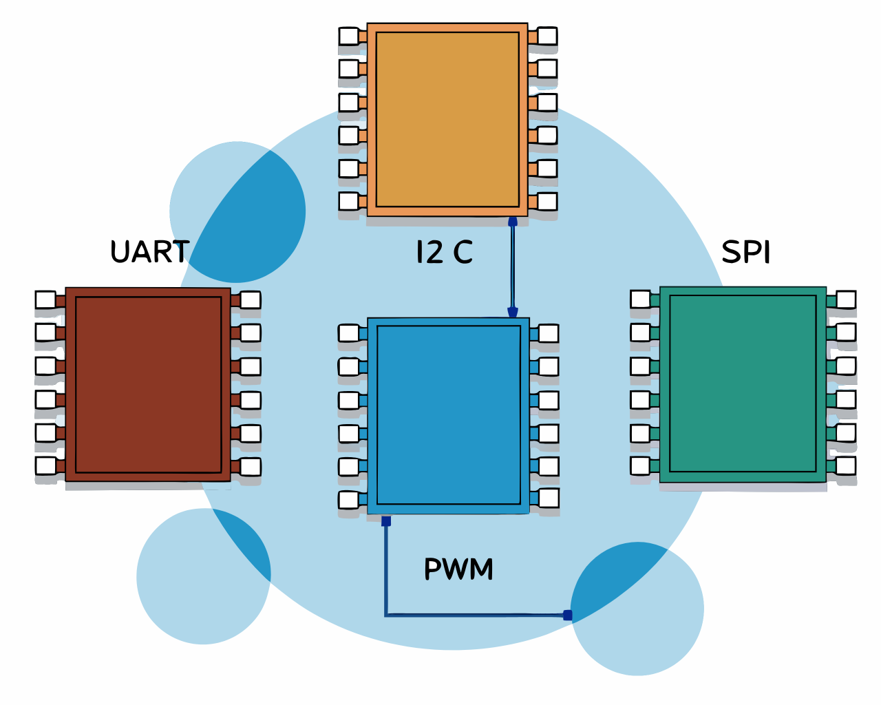 I2C总线更狠,只用两根线SDA和SCL,就能挂一串设备,温度传感器、陀螺仪、显示屏,全给你安排上。