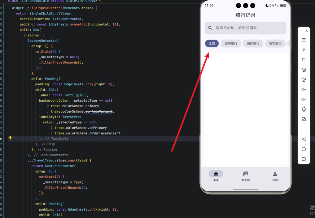 _selectedType,并调用_filterTravelRecords()刷新数据。 - Chip:用于显示每个旅行类型,视觉上类似标签,支持选中与未选中状态的颜色区分。