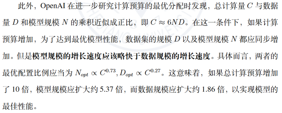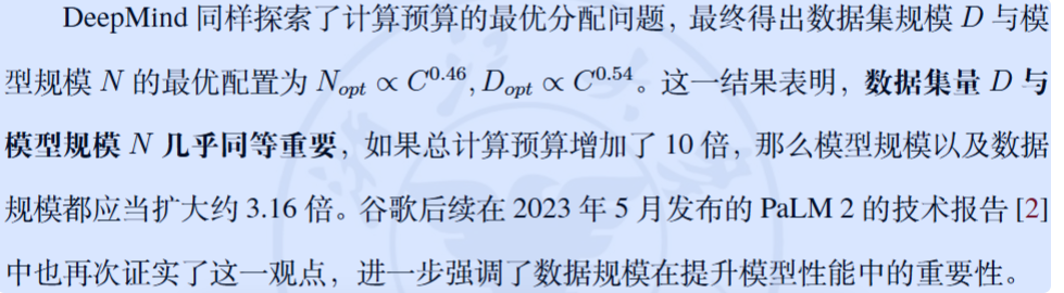 OpenAI 提出的这一扩展法则不仅定量地揭示了数据规模和模型规模对模型能力的重要影响,还指出了在模型规模上的投入应当略高于数据规模上的投入 - Chinchilla 扩展法则