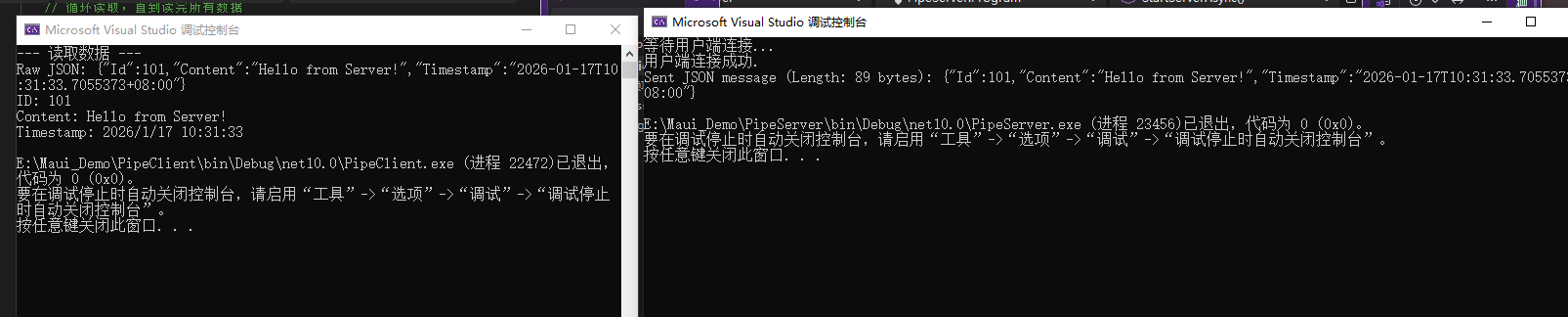 注意: 您必须先启动服务器应用程序,然后再启动客户端应用程序,以便客户端能够连接到正在等待的命名管道。