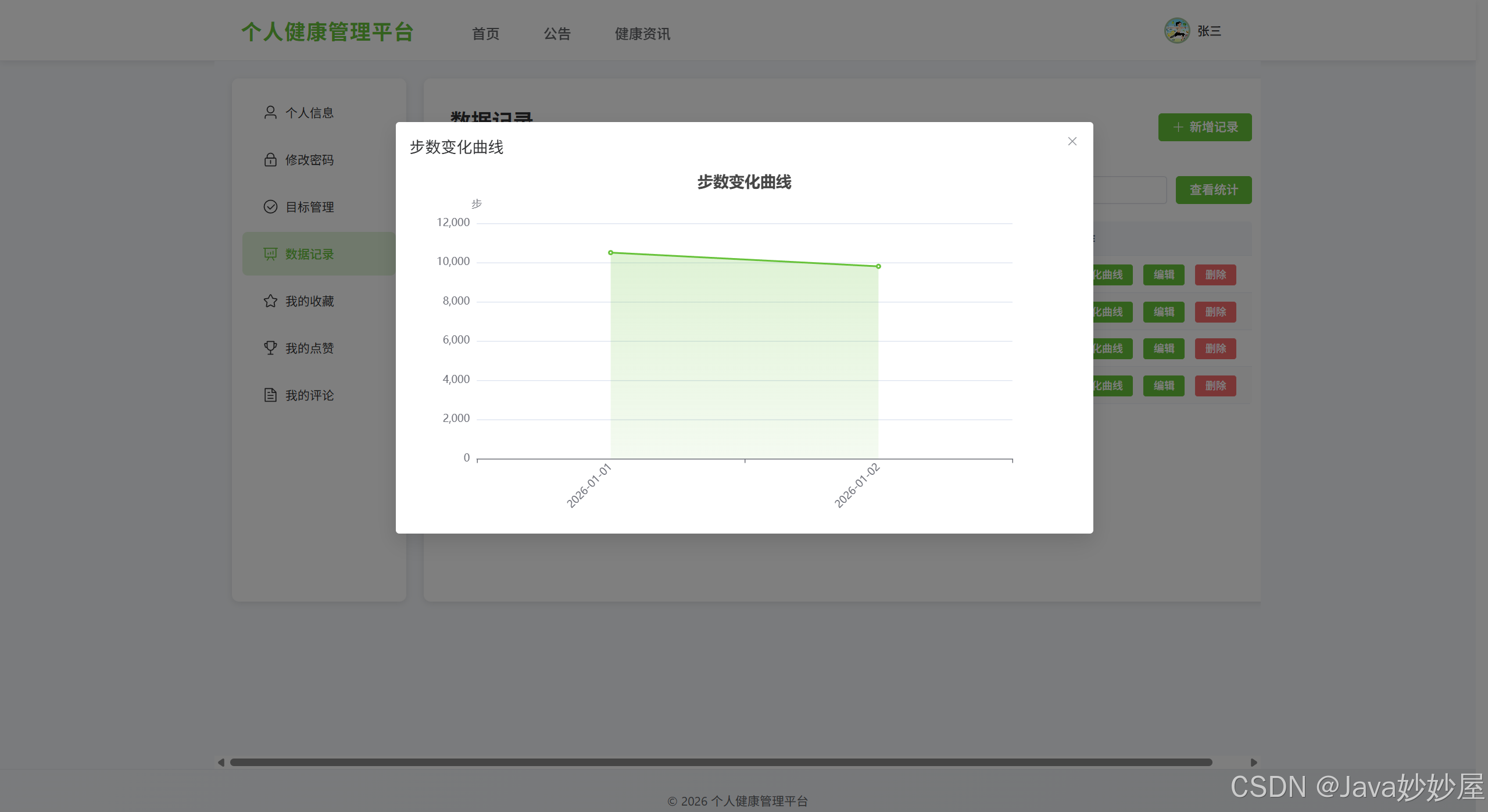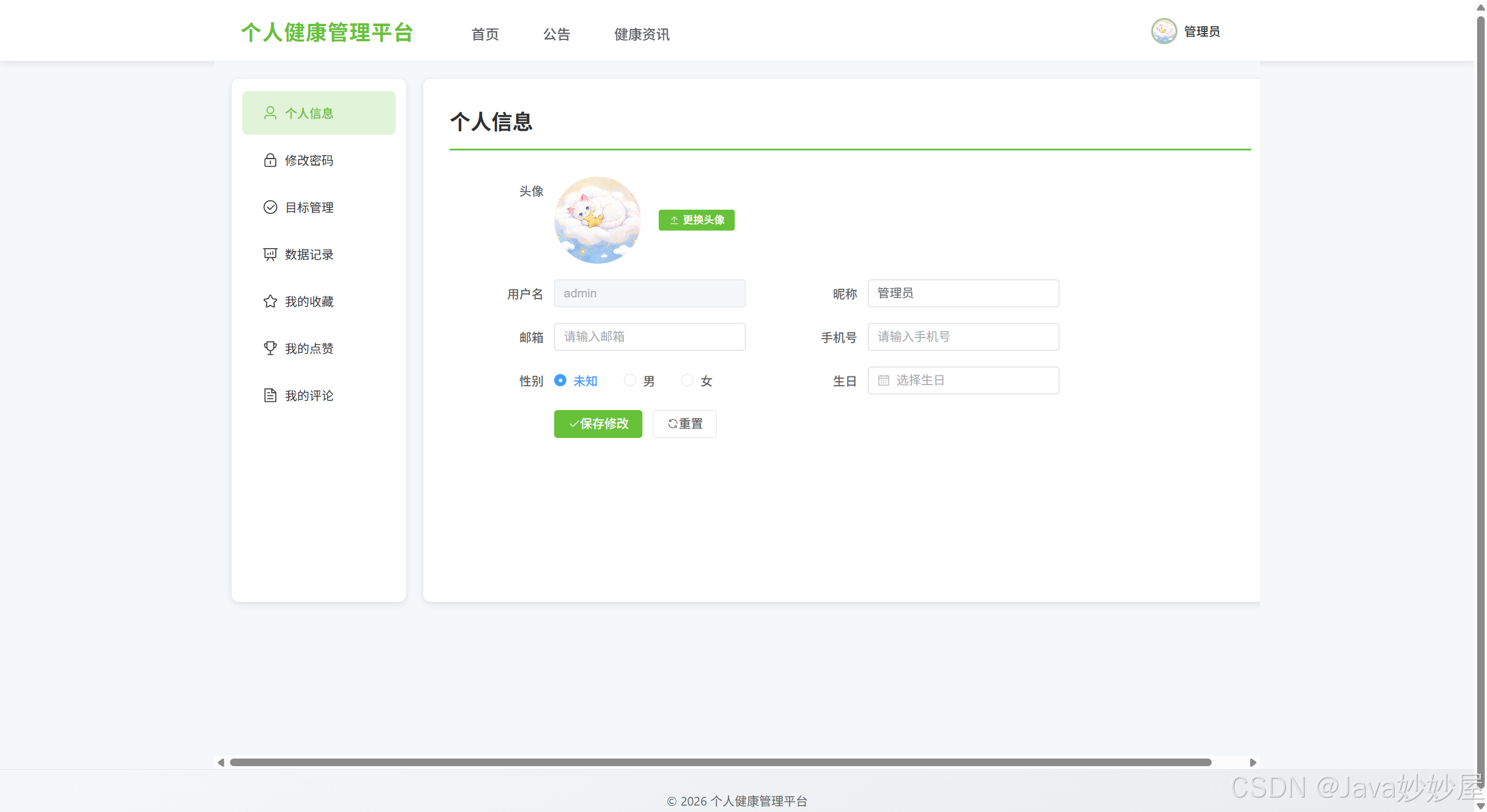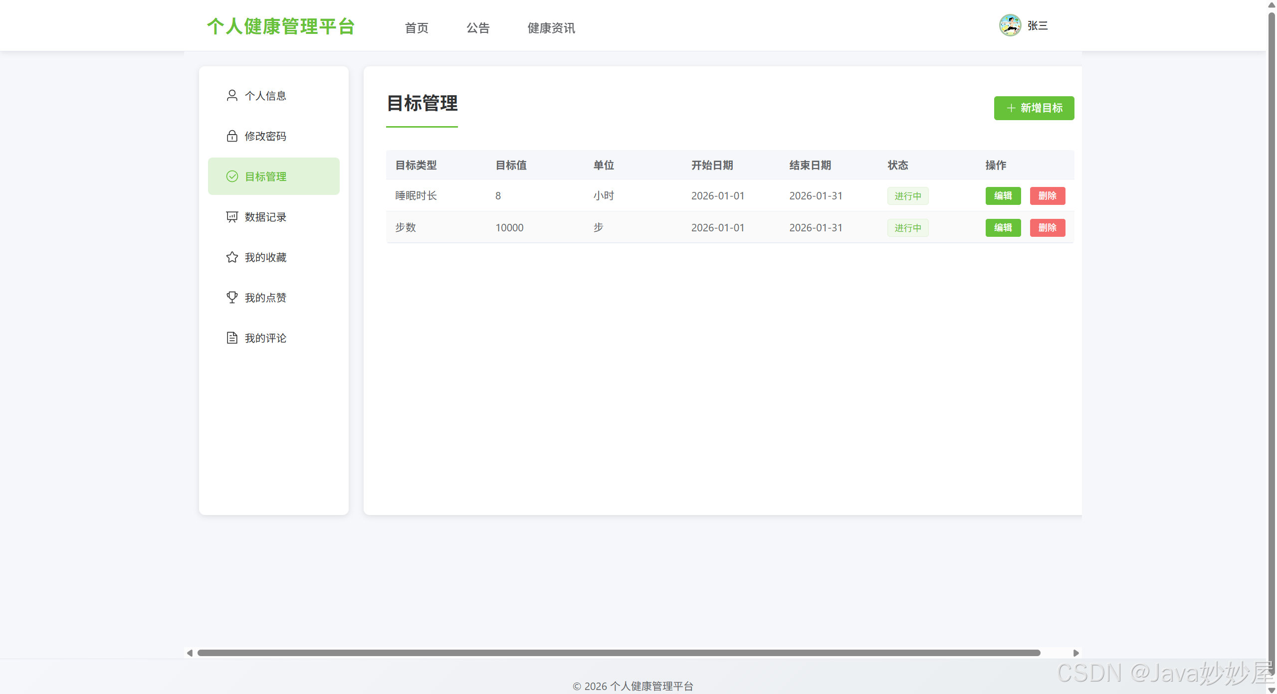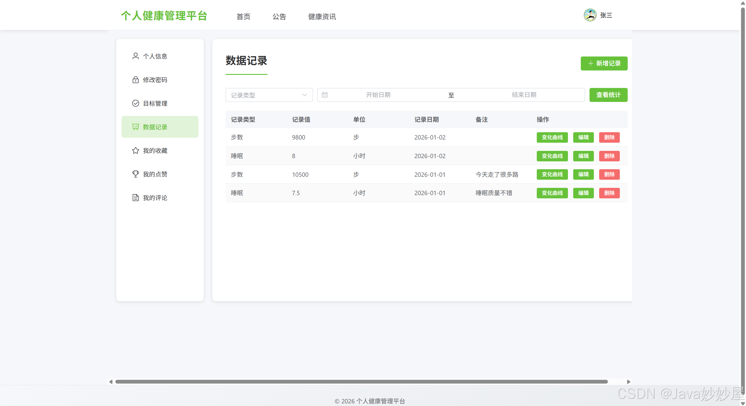基于 Spring Boot 3.1.5 + Vue3 开发的个人健康管理平台,包含管理员和网站用户两种角色,提供健康数据记录、目标管理、健康资讯浏览等功能。