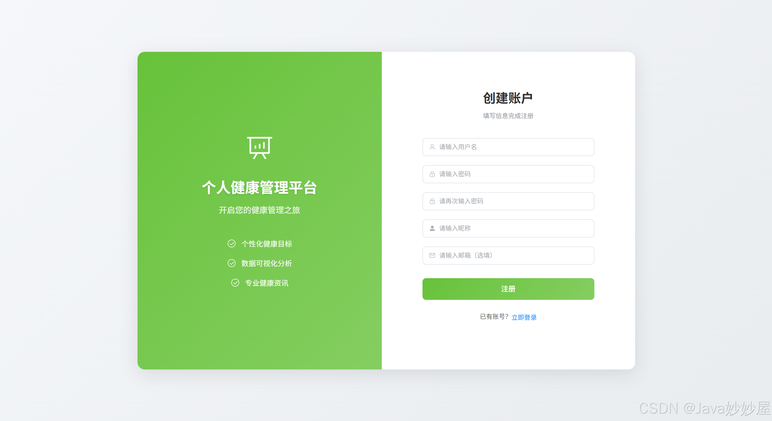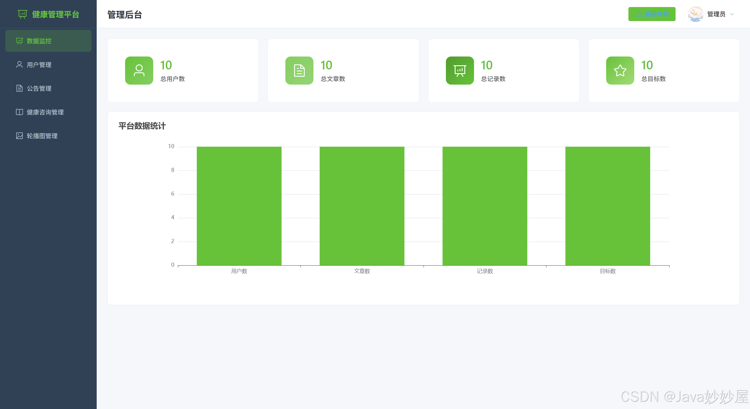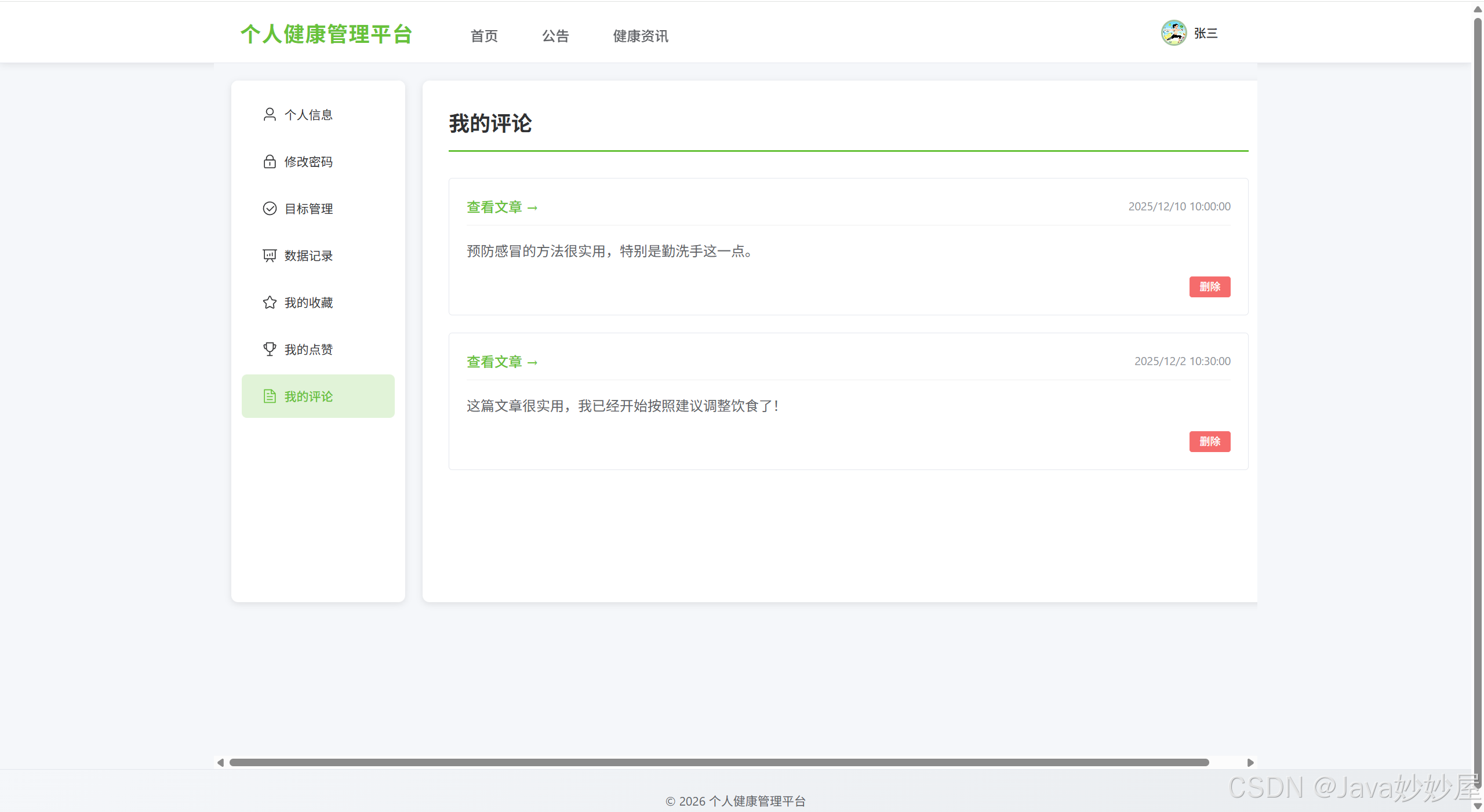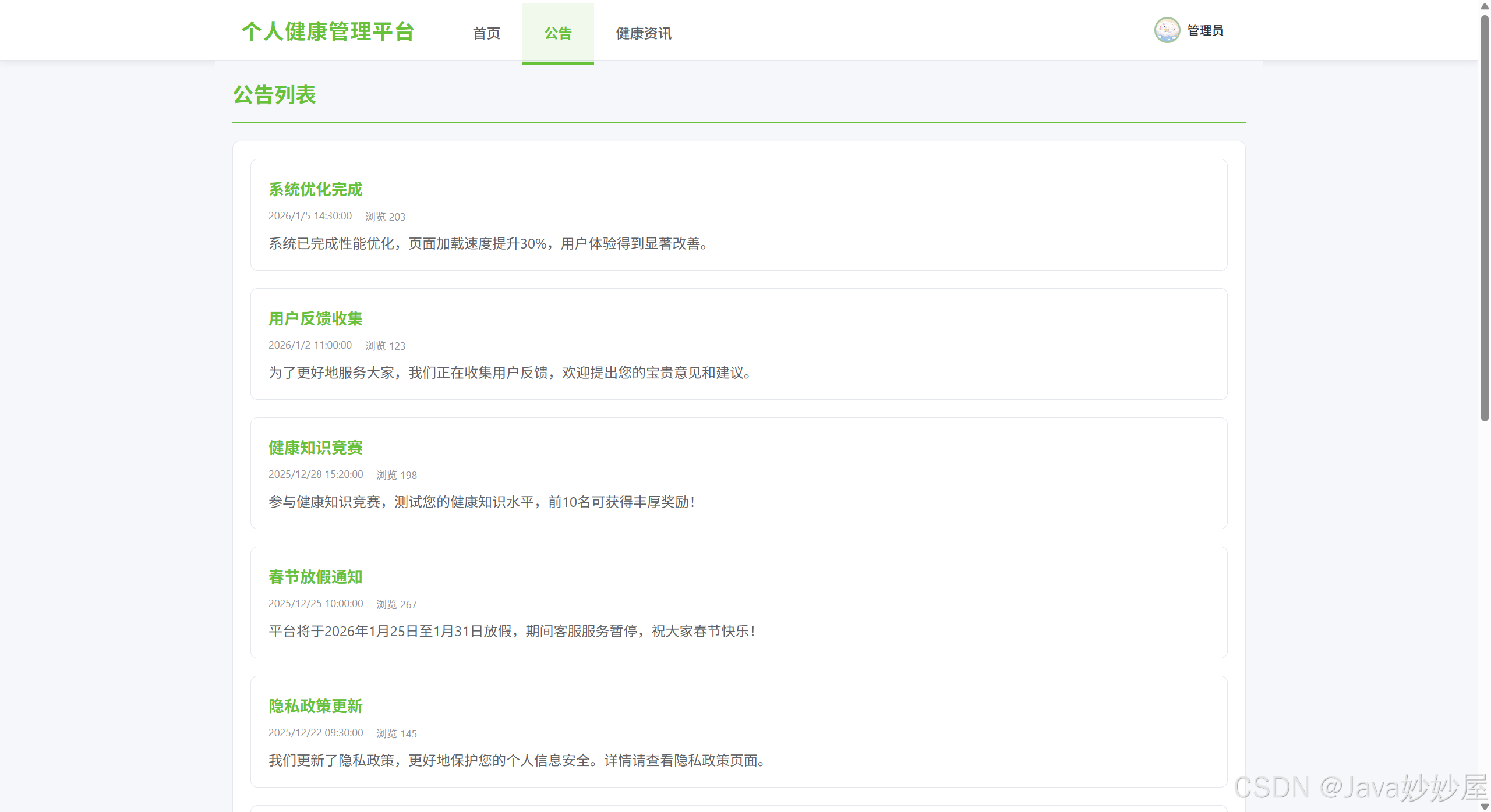 基于 Spring Boot 3.1.5 + Vue3 开发的个人健康管理平台,包含管理员和网站用户两种角色,提供健康数据记录、目标管理、健康资讯浏览等功能。