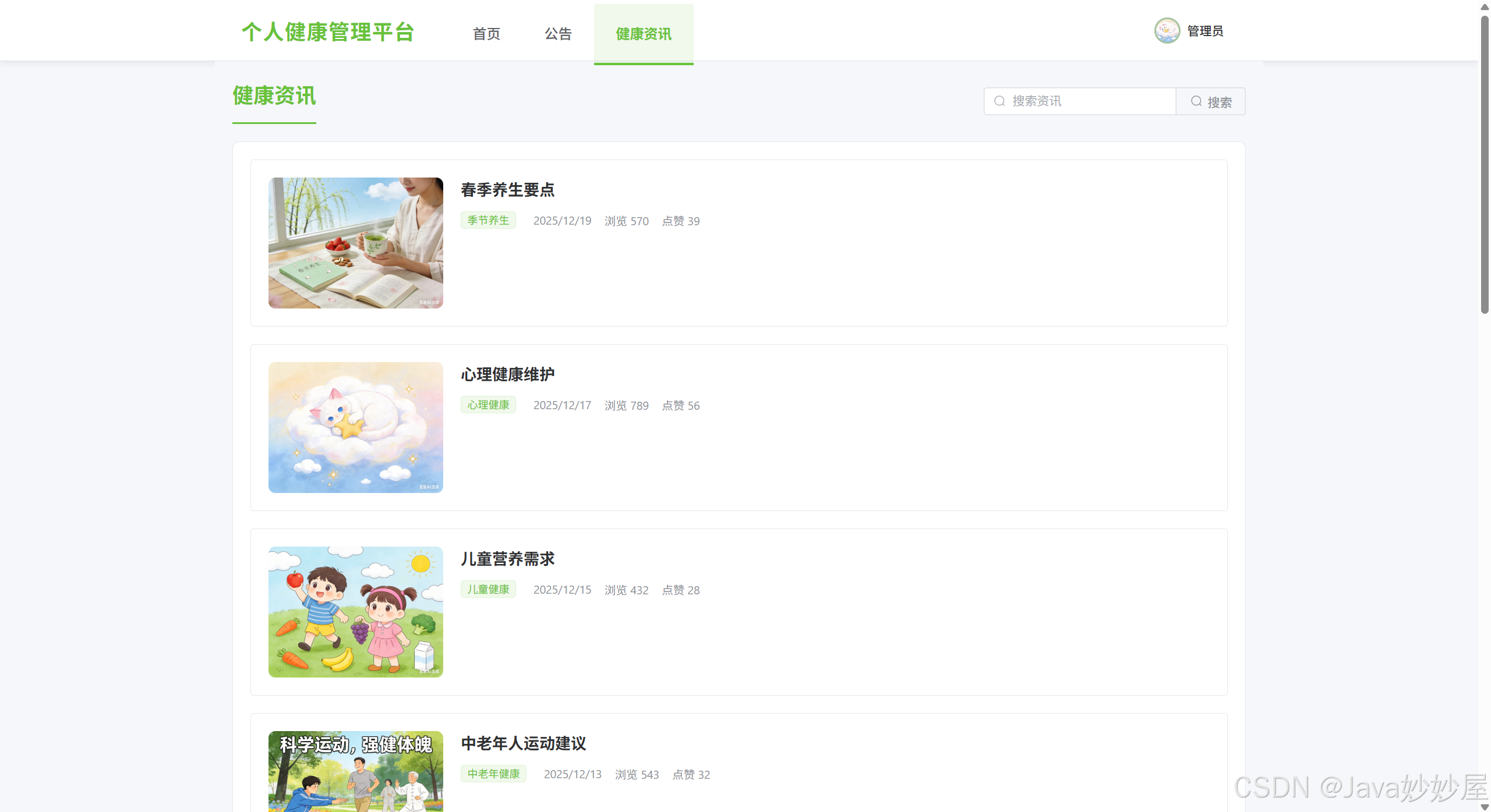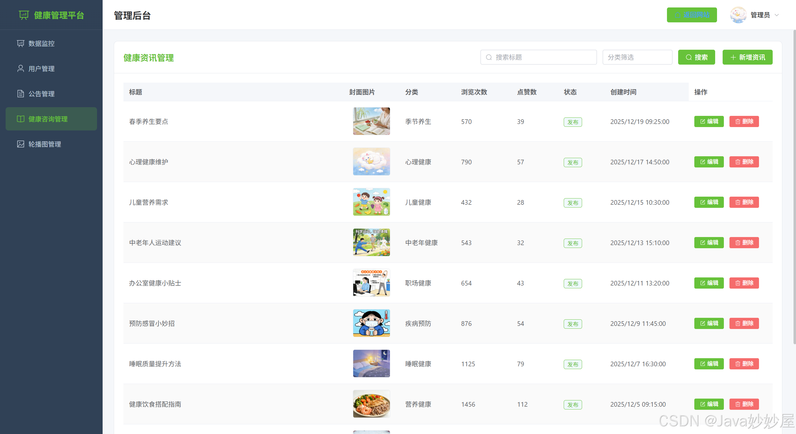 健康资讯管理(支持分页、搜索、分类筛选,展示封面图片)