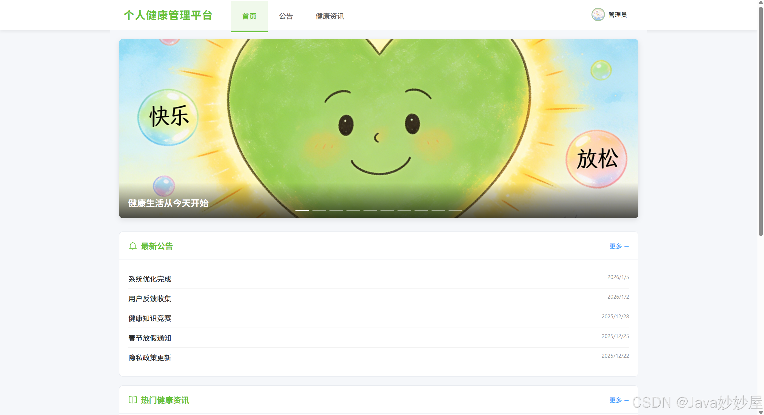 网站首页(轮播图、最新公告、热门健康资讯)