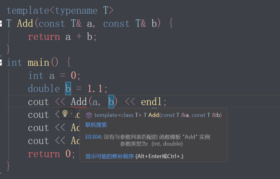 cout << Add<double>(a, b) << endl;//也可以考虑显式实例化,在函数名后加上<参数类型名>