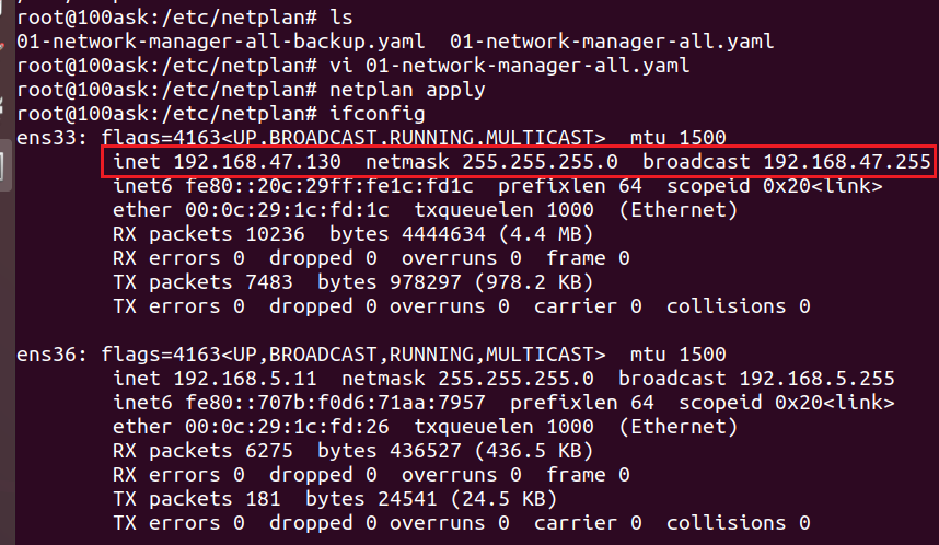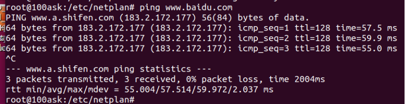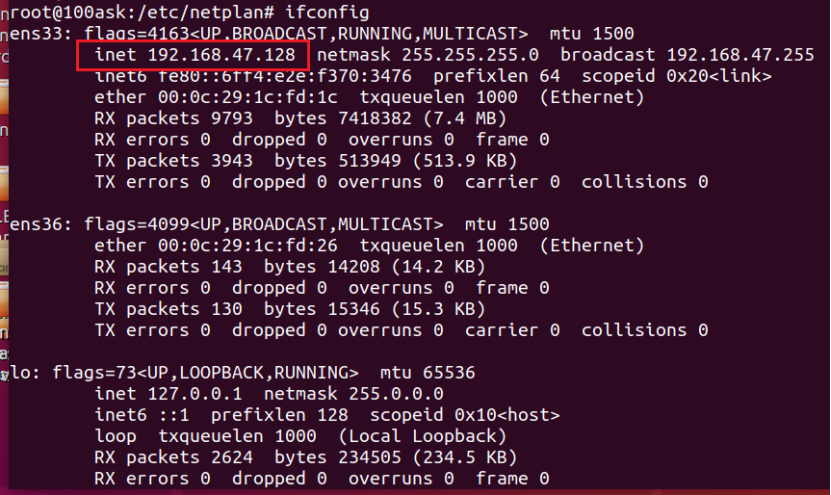 (3)执行重启网络命令 netplan apply 后,查看IP是否配置成功